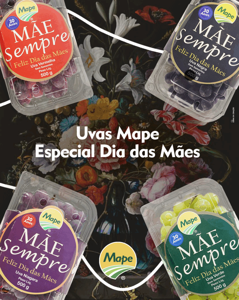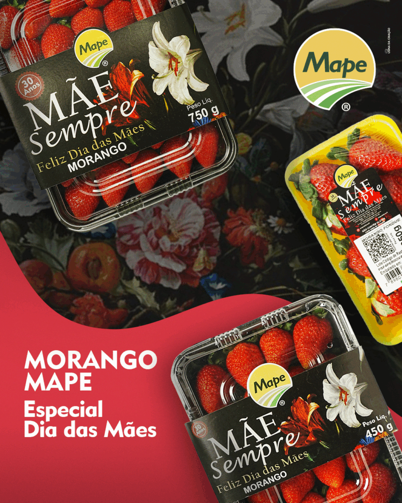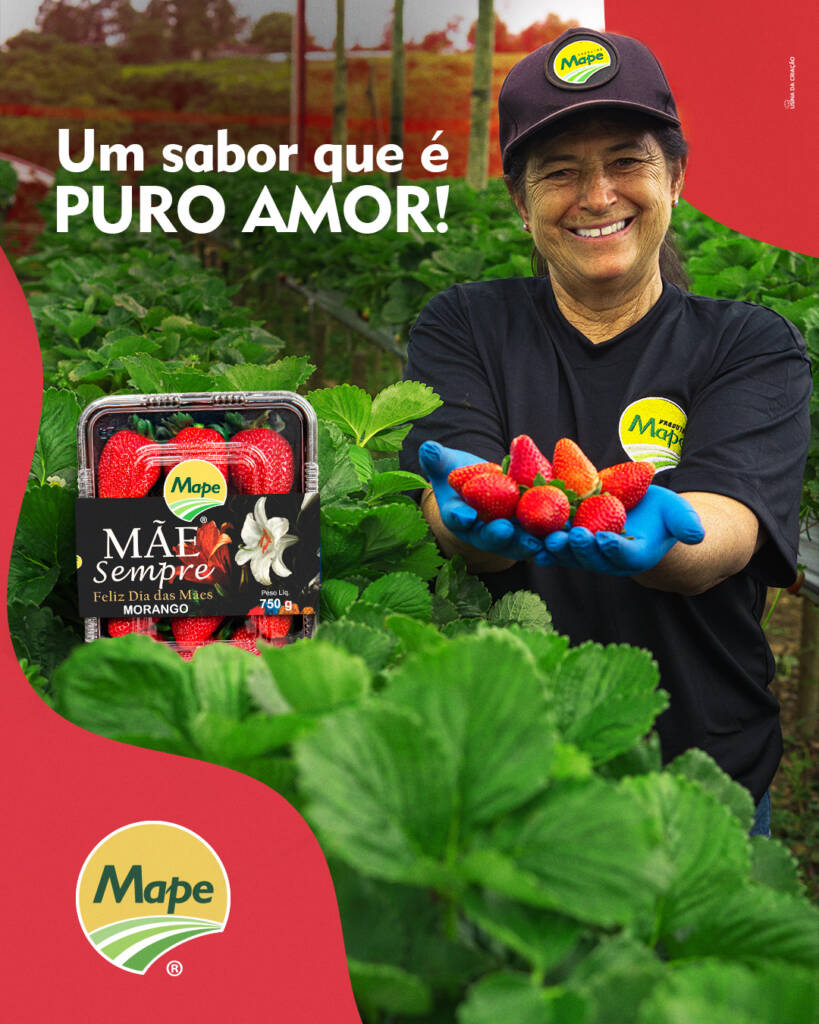 As frutas escolhidas? Uvas Niagara, Uva Verde, Uva Vermelha, Uva Negra e os nossos morangos fresquinhos (nas versões de 250g, 450g e 750g). Produtos que representam saúde, frescor e aquele toque de doçura que lembra o cuidado das mães. A campanha reforçou o compromisso da MAPE com cada família: oferecer alimentos de qualidade, cultivados com responsabilidade e entregues com muito afeto. Porque aqui, assim como no amor de mãe, o cuidado não tira folga!